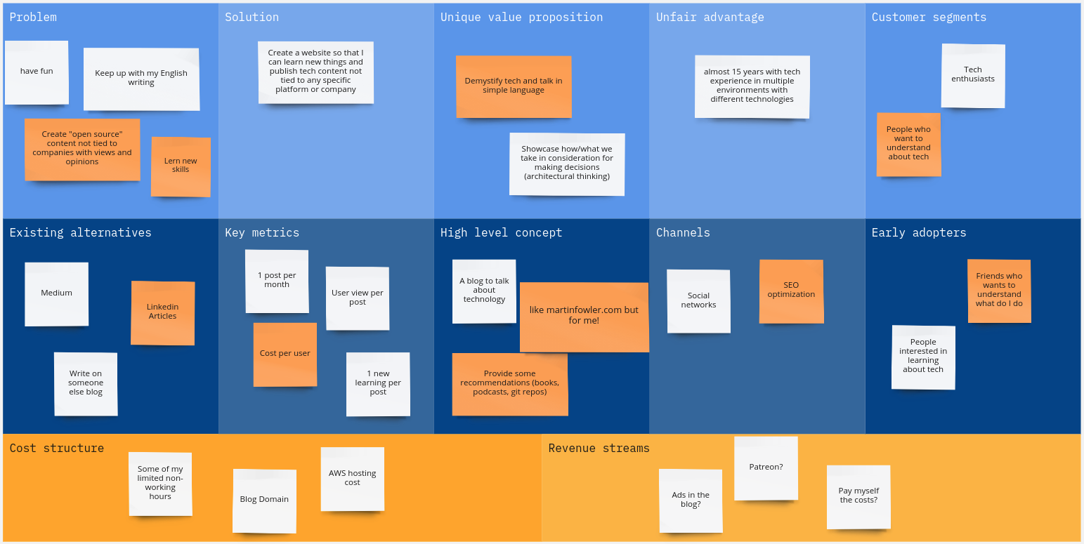 Well, just because I listed them it doesn't mean I tested all of them for the blog use case in this post :P. I picked my favorite one: the Lean Canvas. I also like the Golden Circle a lot (to prove my point I actually mentioned it in my previous post) and I think it helps with the Root Purpose and Business Definition/Selling proposition but I feel like it is not as structured as the Lean Canvas and without proper guidance it will fall short on Target Customer Segments and Goals/Metrics.